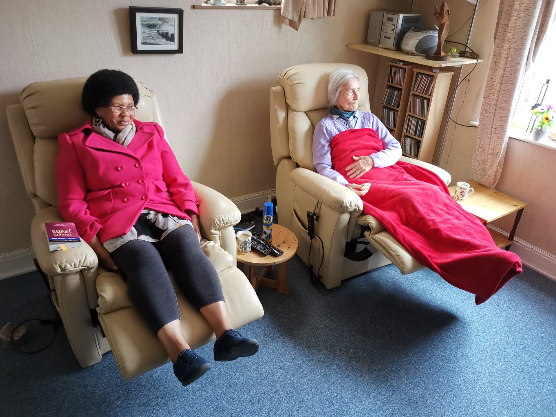 Mother Audrey, now approaching 94 and well advanced on her Alzheimers journey, brilliantly cared for by Getrude, above, joined by Clara below as the dynamic duo who’ve been the most wonderful support. Aud soldiers on with the physical momentum of a supertanker, slowly coming to a halt after the engine was switched off. Still living in her own home of the past 54 years, just round the corner from us, and with a lifetime’s passion for Europe blissfully and thankfully unaware of the twin disasters Brexit and Covid.