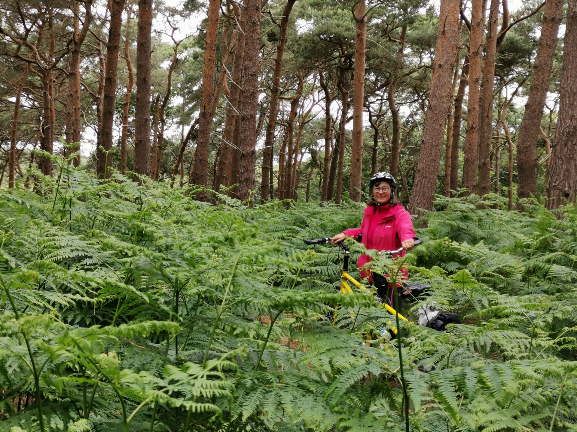 During spring and summer, we both got out a good deal on Daisy our tandem, here with Jutta lost in the woods behind Sheringham. We did find our way home, with a great big pine needle lodged in the back tyre.
