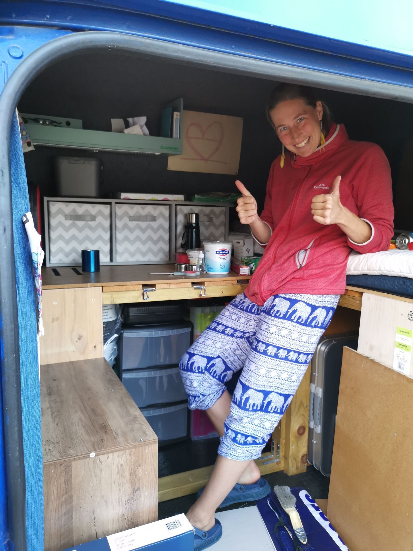 Kat’s campervan Bernie with proud owner and resident. Sadly Bernie, parked up in Austria with a local registration and Kat safely with a German passport, has a terminally rusty bottom, and is heading for the scrap heap. Thankfully, the same applies less to Kat than it does to her parents…