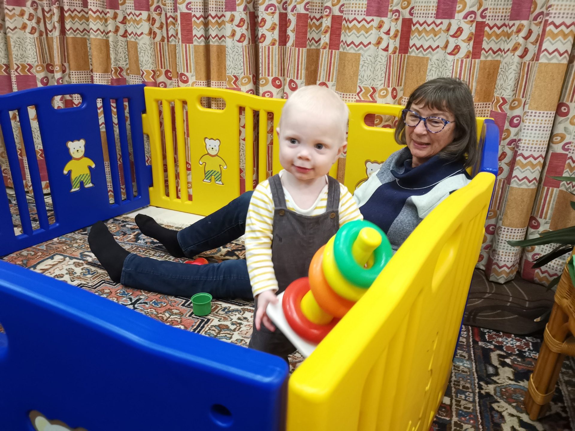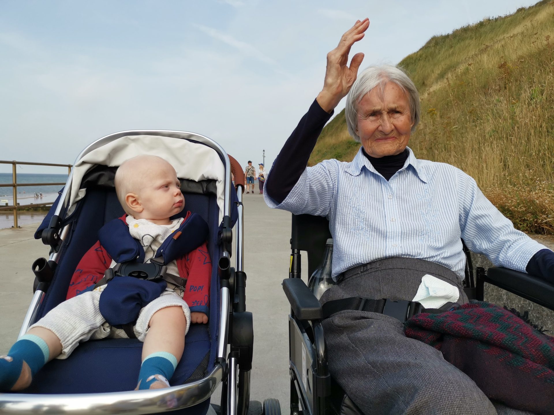 Shading into family. Leo is now over a year old, and seen here looking after his grandmother – Oma – in her playpen.