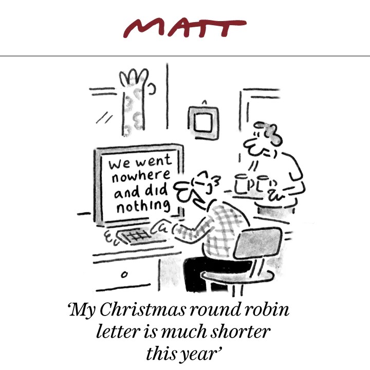 I’m sure I’m breaching copyright something rotten, but for our (much-later-than-usual) 2020 Christmas/New Year letter, the Telegraph’s Matt pretty much nailed it.