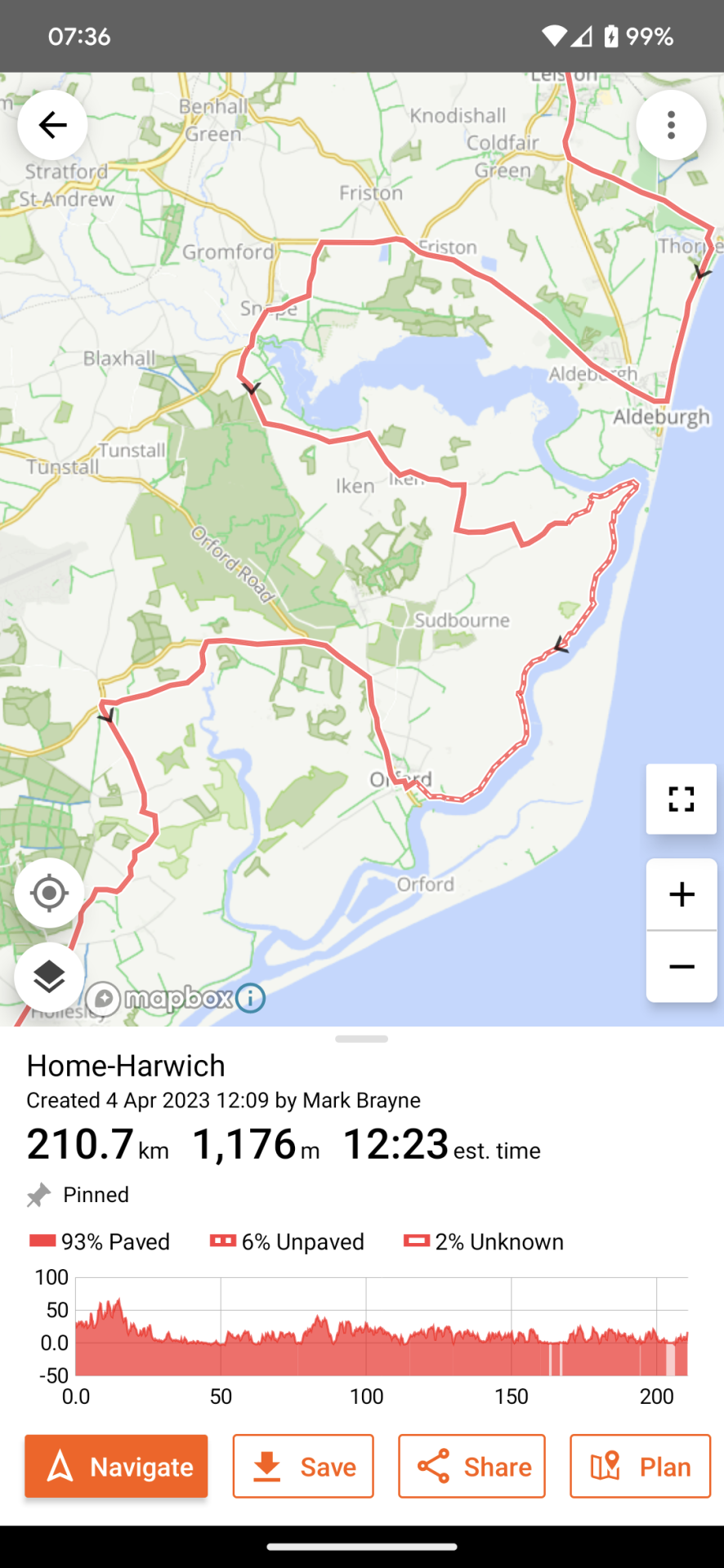 Ride With GPS very clear that the best route (see map snapshot with the black arrows) was along the dotted lines just across the mouth of the river from Aldeburgh.
