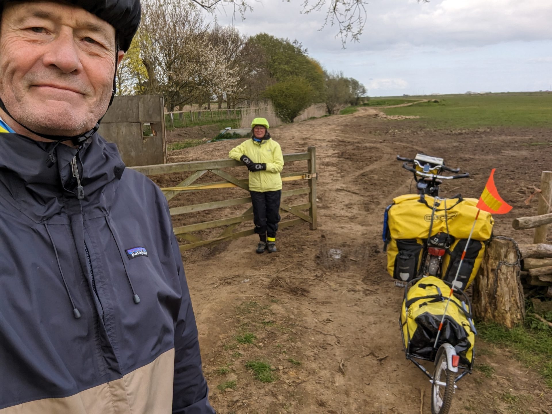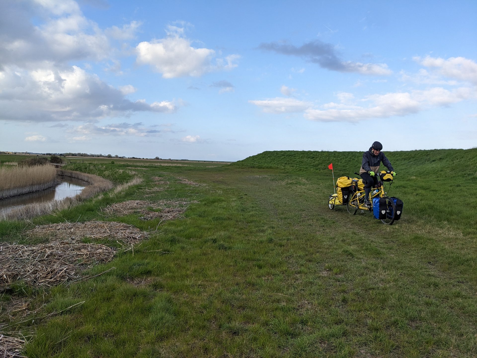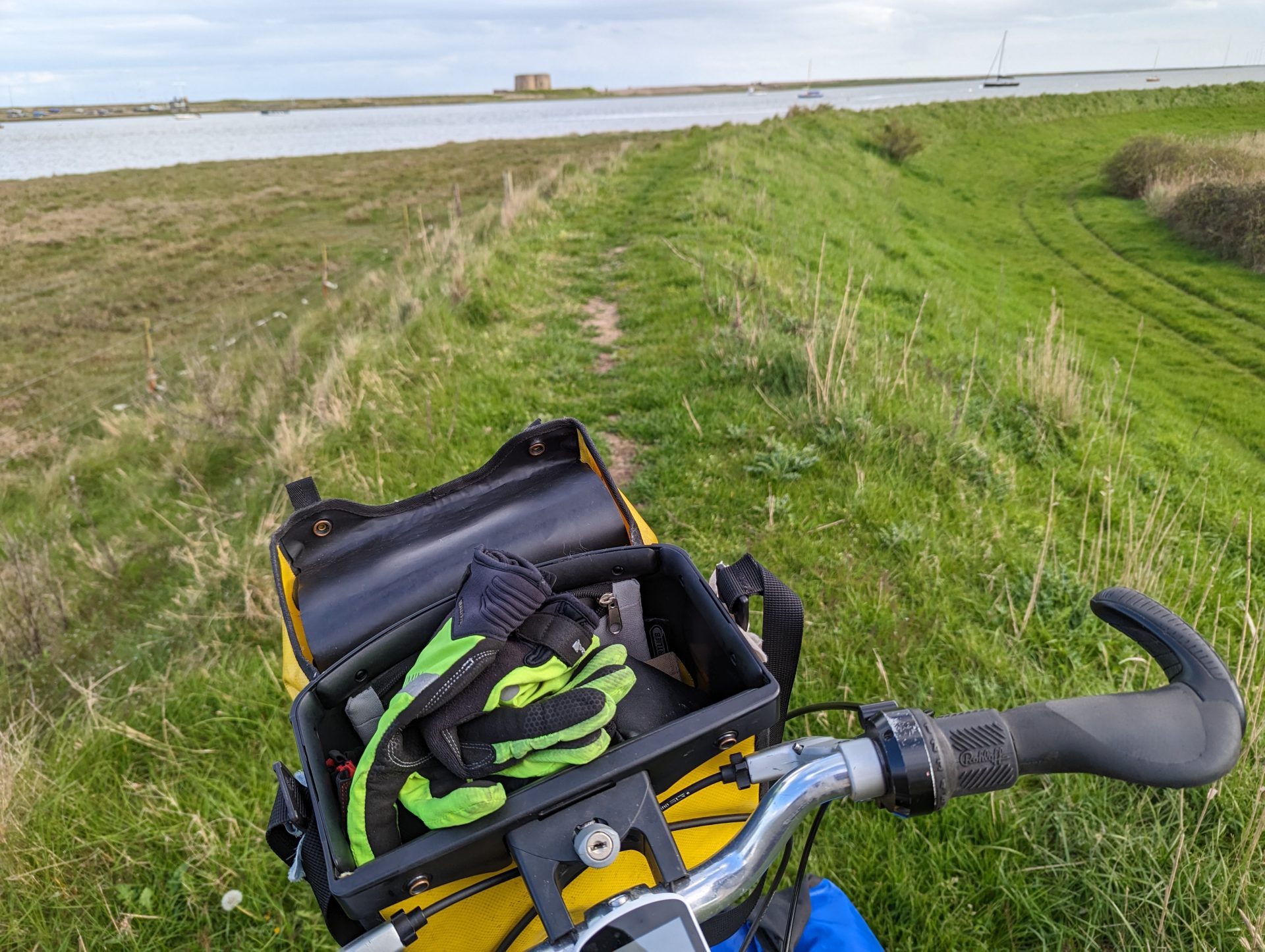 Shaft of light just short of Orford in Suffolk (itself 30 miles short of our immediate destination today, the port of Harwich) almost illuminating one of the silliest routing decisions we’ve ever taken on a tandem tour, taking us through fields, grass and narrowest of footpath gates after narrrowest of gates round the Alde estuary.
