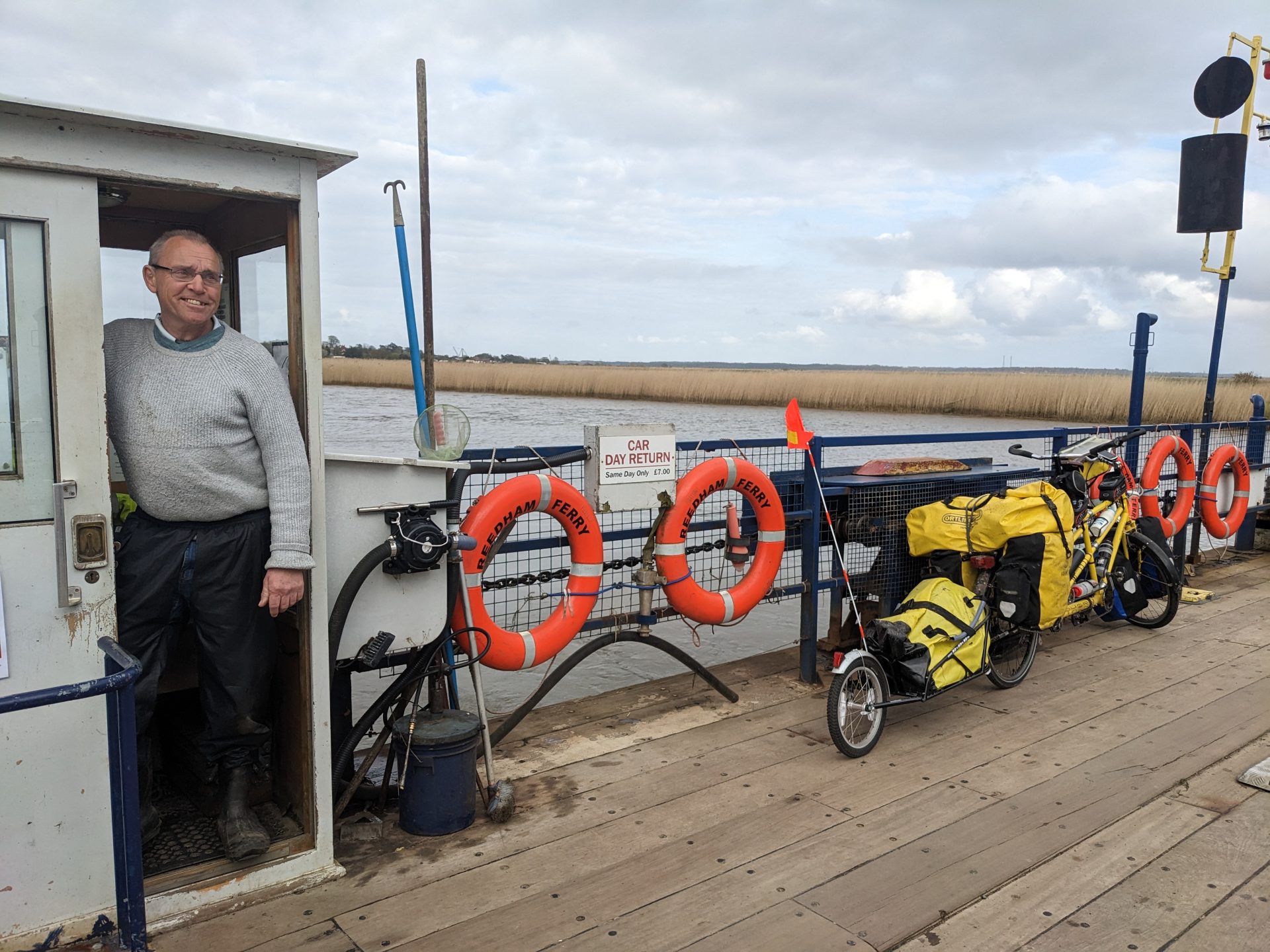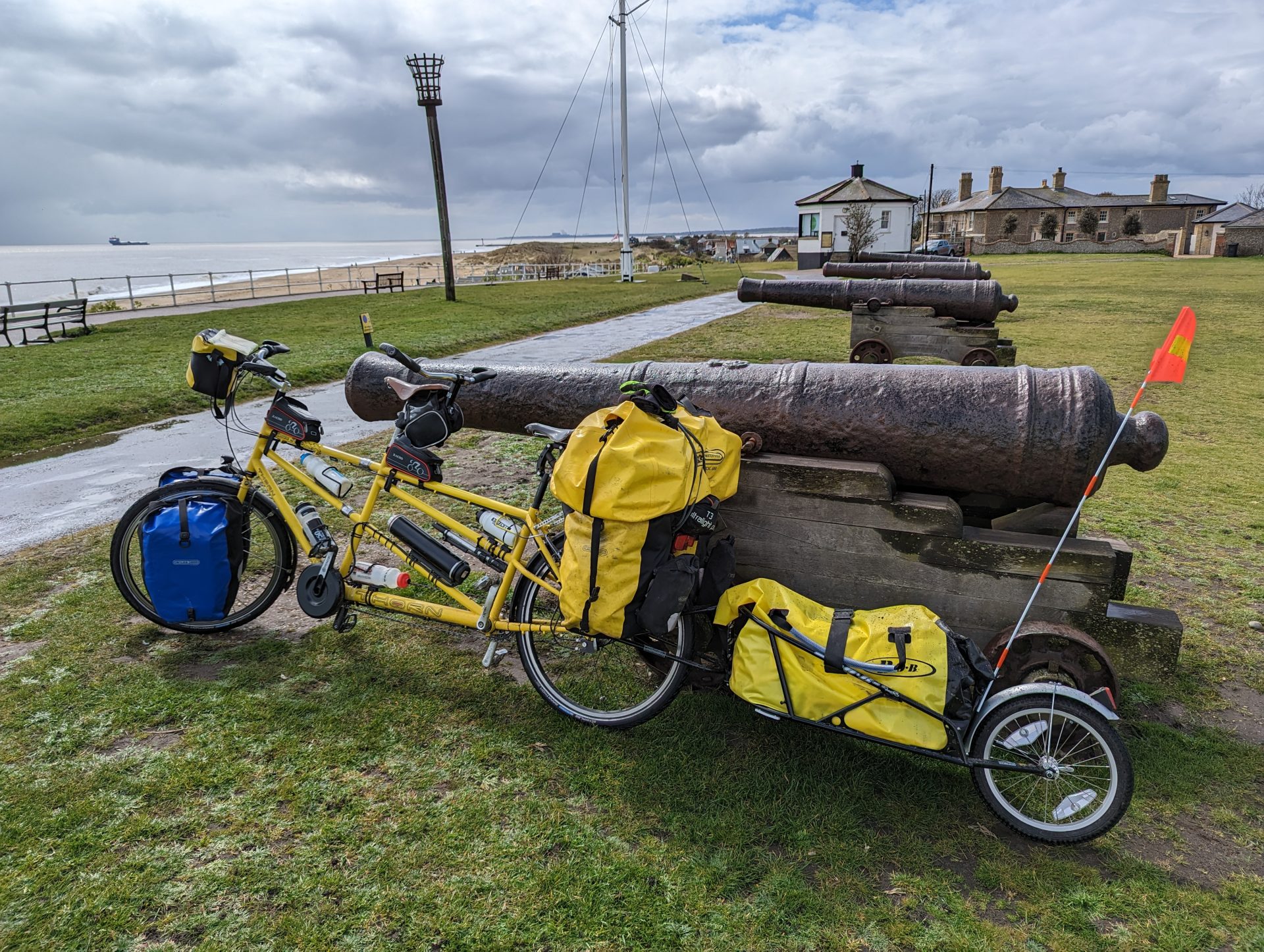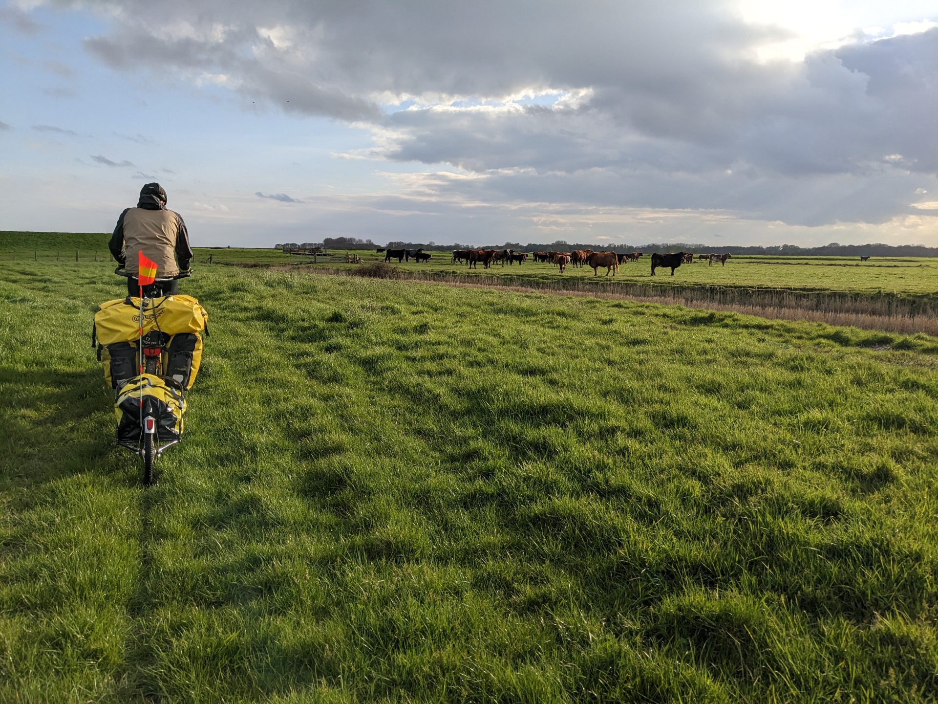 Shaft of light just short of Orford in Suffolk (itself 30 miles short of our immediate destination today, the port of Harwich) almost illuminating one of the silliest routing decisions we’ve ever taken on a tandem tour, taking us through fields, grass and narrowest of footpath gates after narrrowest of gates round the Alde estuary.