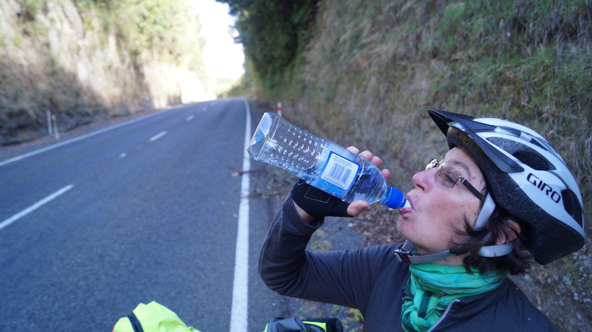 We get through a LOT of this stuff. Up to eight half-litre bottles a day between us. Means carrying a lot of watery extra weight, as there are virtually no cafes or rest stops on the way where one can buy a drink. Photo also illustrating the excellent Western Access Road along Lake Taupo, cut through the contours to give bicycles a most friendly set of gradients, even if some go on for ever.