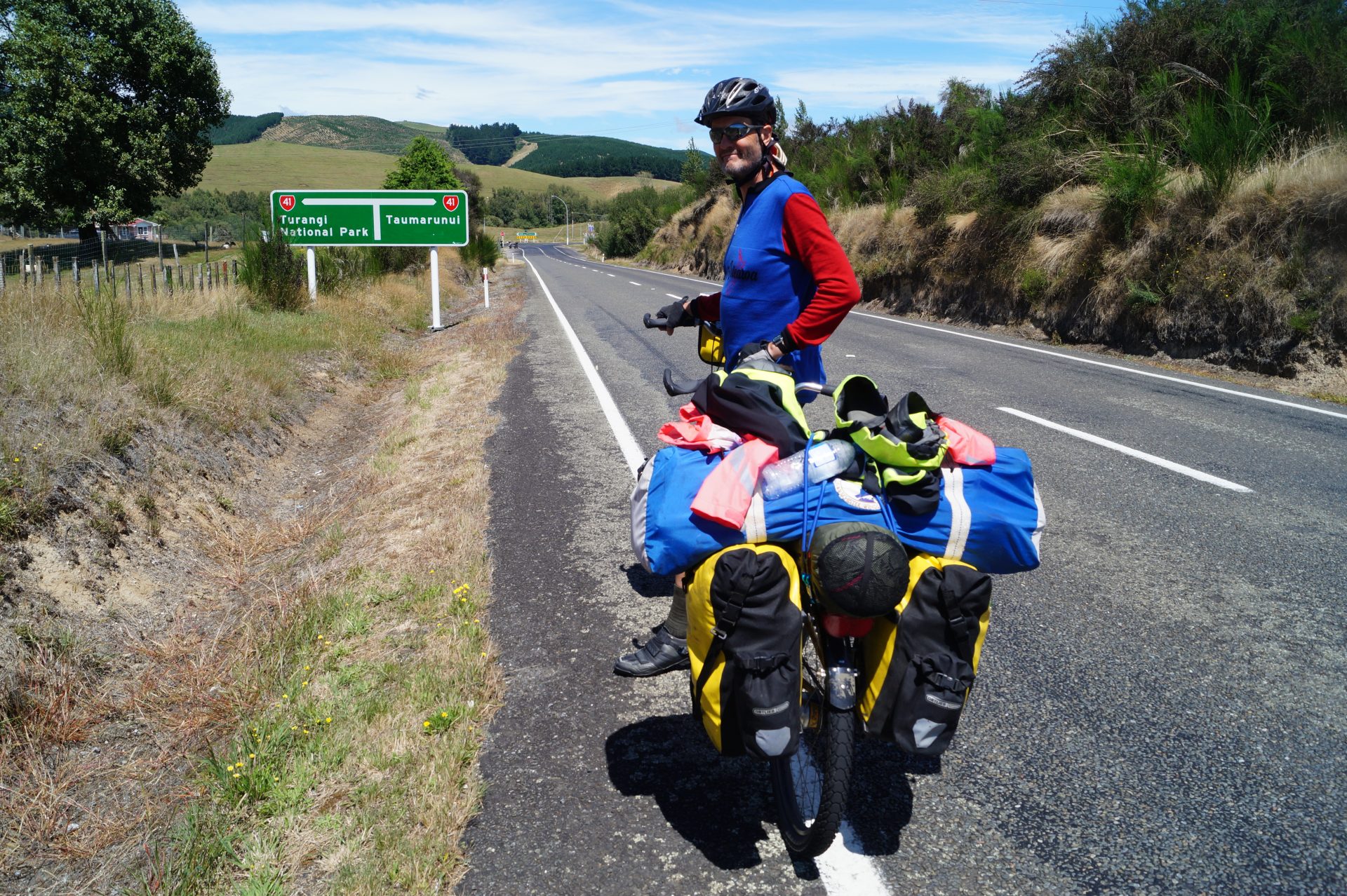 Mark wearing his official Tour Aotearoa Merino cycling top, with thumbnail map of New Zealand positioned right on the nipple. Curious lighting effect – and I thought I was losing weight on this trip. Approaching the junction off the Western Access Road that takes us left and east to Turangi.