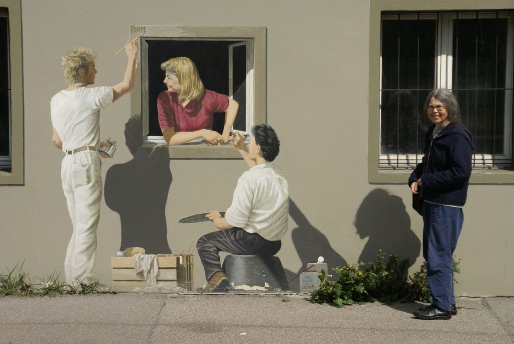 The other photo is just Clare and some interesting local paintings. Taken for us by a sweet Japanese tourist lady who really knew how to use a camera – taking enough time to cause a pedestrian traffic jam on the pavement as the patient Bernese (so this is where the sauce comes from) waited for her to frame the shot and finish.