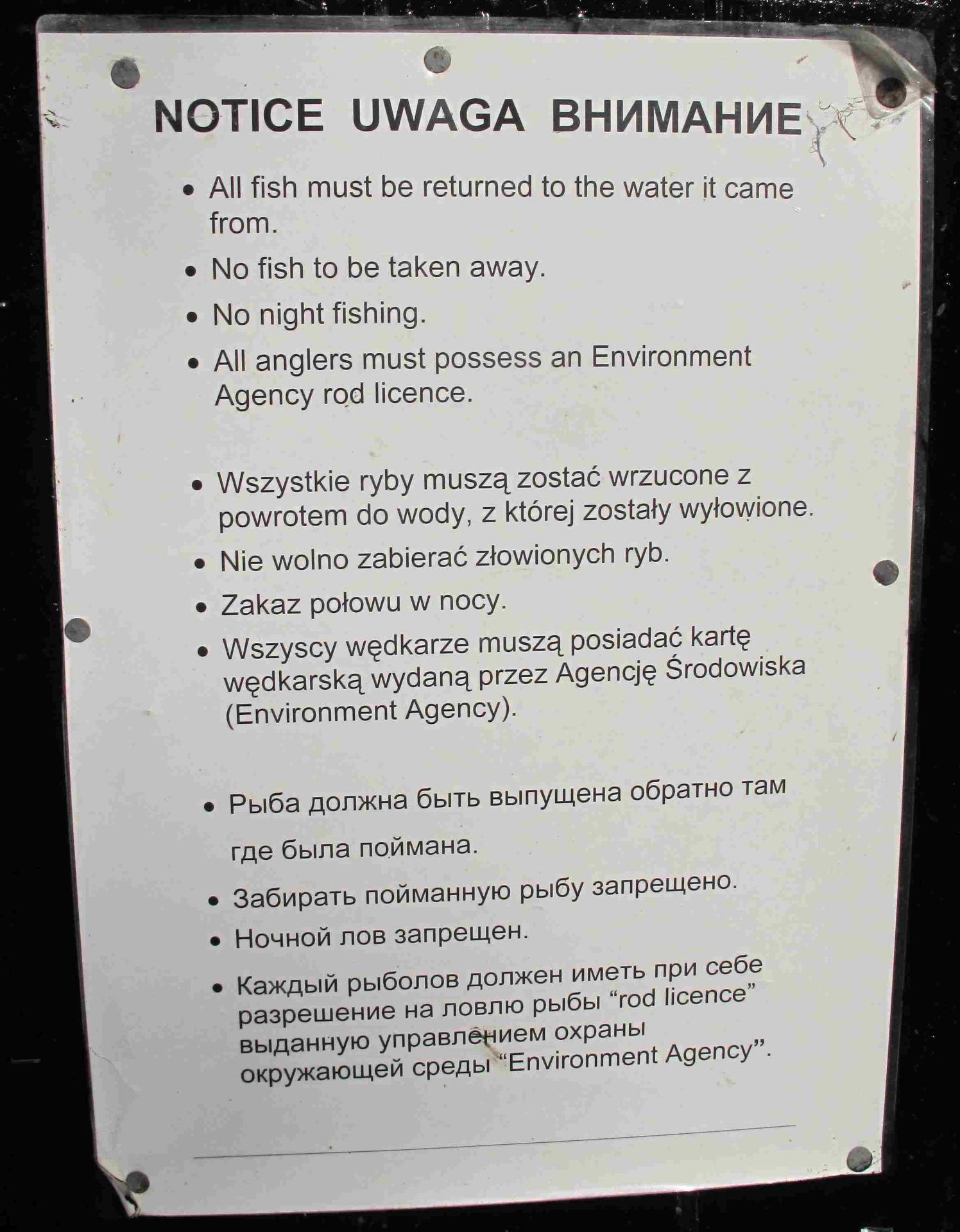 The sign warning that fish in this canal, if caught, MUST be returned to the water (and, therefore, not eaten), is in English, Polish and Russian. I recall that The Sun newspaper once ran a rather nasty anti-immigrant front-page headline accusing East European asylum-seekers of capturing and eating swans. That one wasn’t true, but English canal fish do appear to have been having a rougher time of it.